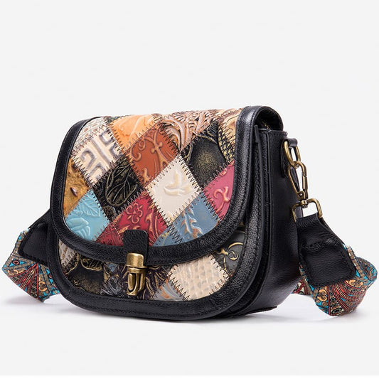 kleine bunte Umhängetasche Damen Patchwork Leder mit breitem Gurt