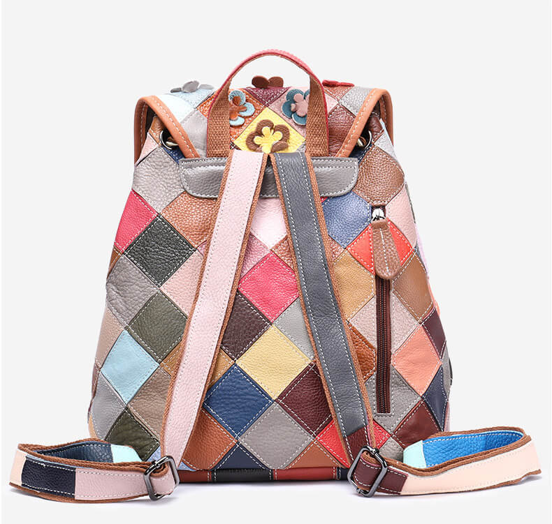Einzigartiges Design: Dieser Damenrucksack kombiniert zwei Stilrichtungen –Gefolchten und 3D-Blumenmuster. Die Farben sind reichhaltig und variabel, wobei jedes Stück aufgrund der zufällig ausgewählten Lederstücke einzigartig ist, was die Individualität und den Geschmack der Trägerin unterstreicht.
