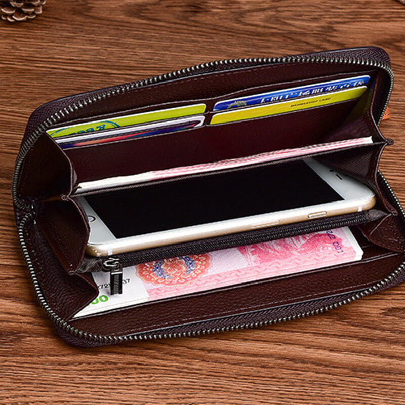 Design: Es verfügt über 8 sorgfältig angeordnete Kartenfächer, die problemlos verschiedene Bankkarten und Mitgliedskarten aufnehmen können. Außerdem gibt es 2 geräumige Scheinfächer und 1 Reißverschlussmünztasche, die Ihre Finanzverwaltung ordentlich und übersichtlich halten.