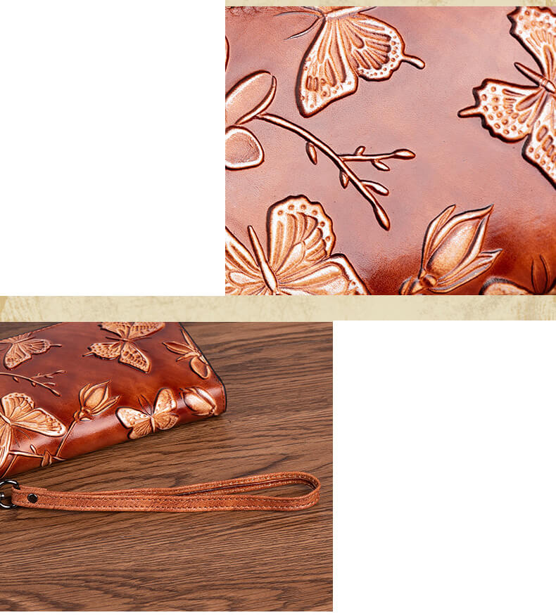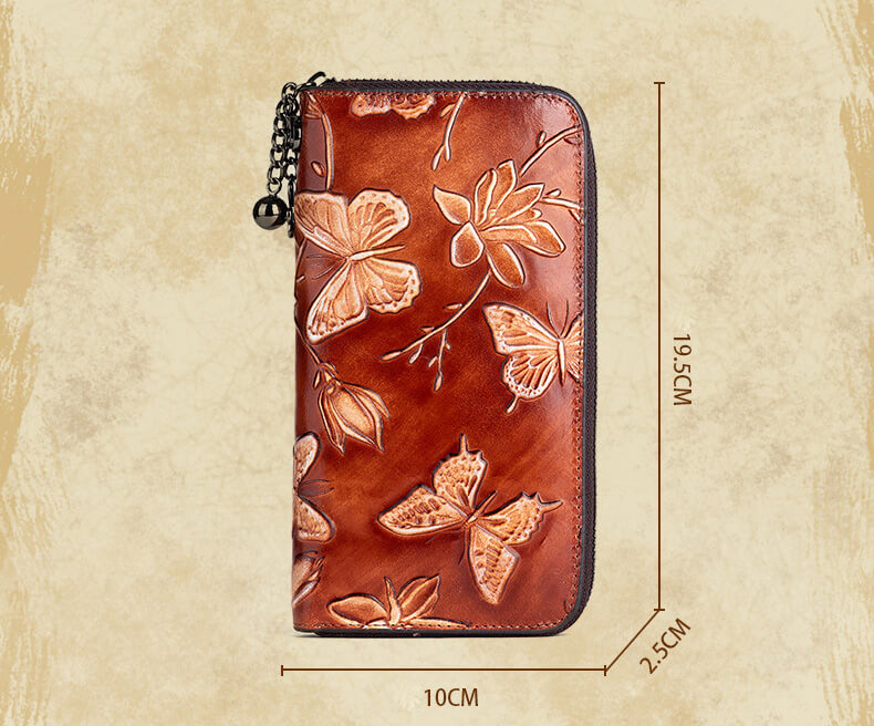 Material: Dieses lange Damenportemonnaie aus echtem Leder ist im Used-Look gefertigt und versetzt Sie sofort in die Vergangenheit. Auf der Oberfläche des Portemonnaies wird mit exquisiter Drucktechnik ein lebendiges Schmetterlingsmuster kreiert, das mit seiner Leichtigkeit und Anmut dem Gesamtbild eine Note von Zartheit und Romantik verleiht und zum Verlieben einlädt.