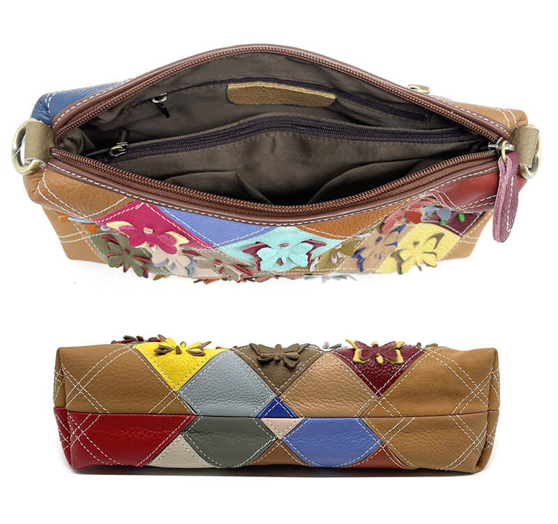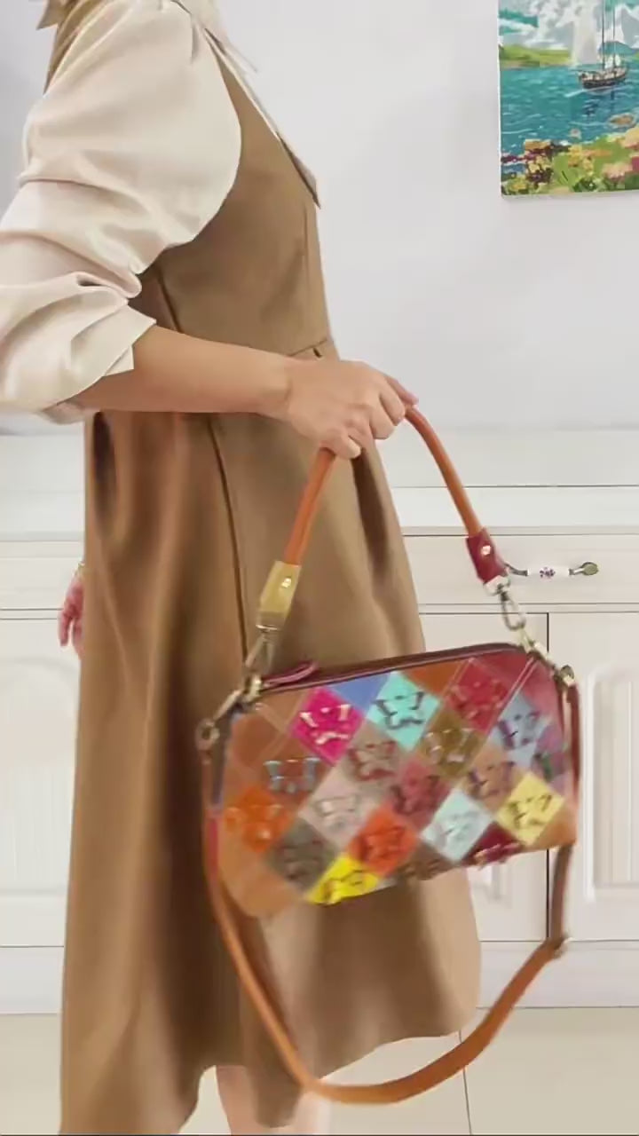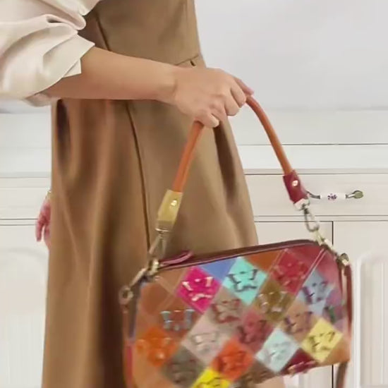 Gefertigt aus zufällig zusammengesetzten, farbigen Echtleder-Elementen ist jede Tasche ein Unikat in ihrer Farbkomposition. So unterstreicht sie die Individualität und das modische Selbstbewusstsein der Trägerin. Das plastische Schmetterlingsmotiv auf der Vorderseite verleiht der Tasche zudem eine lebendige und verspielte Note.