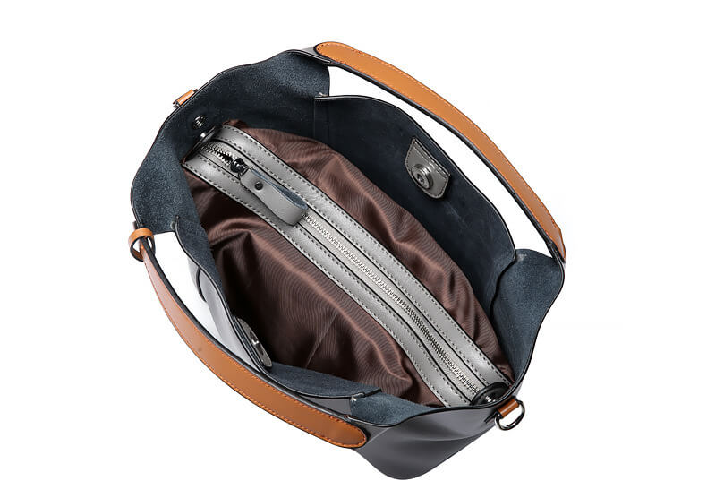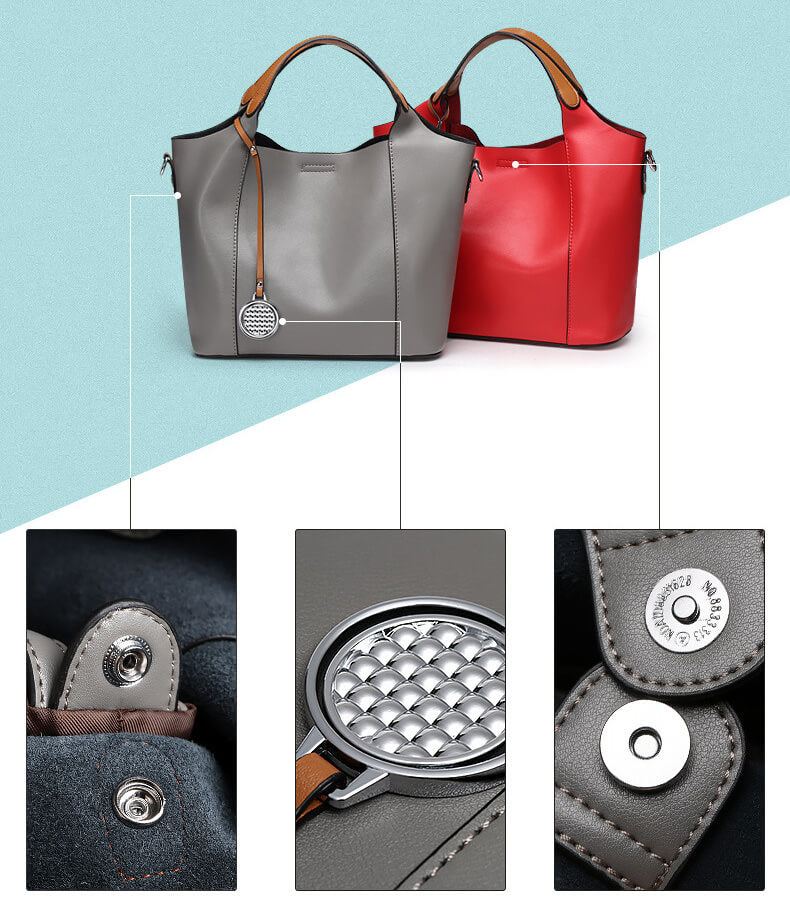 Design: Das Design verfolgt einen schlichten und eleganten Stil, der auf überflüssige Dekorationen verzichtet und klassische Ästhetik durch pure Farben und Linien interpretiert. Die Tasche ist in fünf reinen Farben erhältlich: Schwarz, Braun, Grau, Grün und Lila, wobei jede Farbe eine unterschiedliche Persönlichkeit und Ausstrahlung vermittelt. Besonders hervorzuheben ist der kontrastierende Farbton der Henkel, der Monotonie aufbricht und einen modischen Akzent setzt. An den Henkeln hängt ein filigraner runder Anhänger, der der Tasche eine lebendige und verspielte Note verleiht.