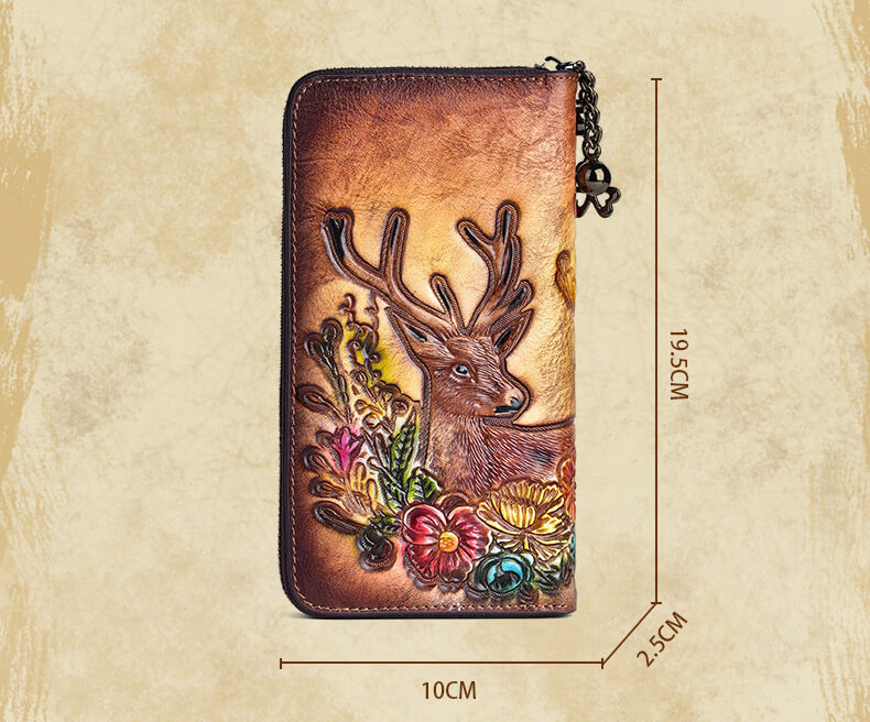 Vintage-Hirschmuster: Die Oberfläche des Geldbeutels ist mit einem detaillierten Hirschmuster geprägt, das die Hirschgeweihe und den Körper lebendig darstellt, während der Hirsch in den Blumen spielt und eine nostalgische Atmosphäre erzeugt. Erhältlich in Braun, Rot und Schwarz.