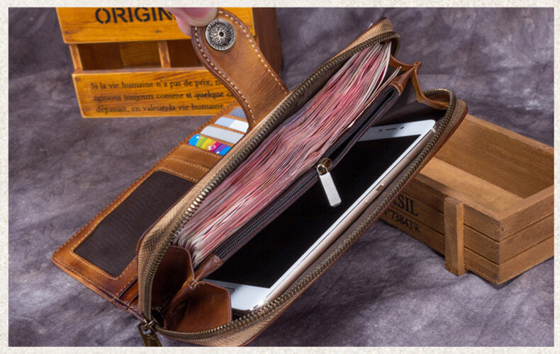 Geldbörse Damen Leder langes Portemonnaie Vintage Geldbeutel mit Reißverschluss