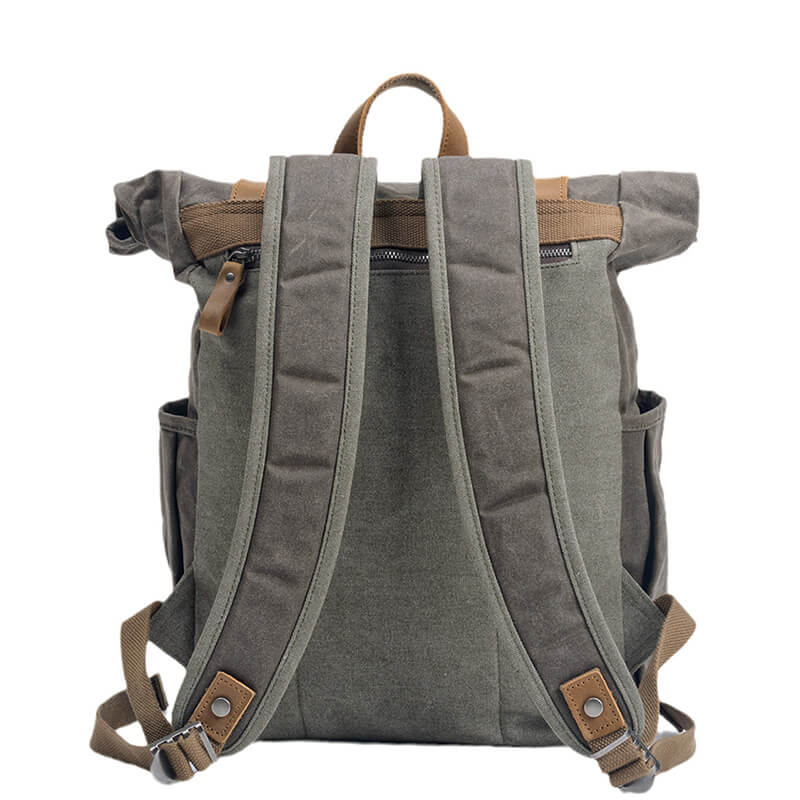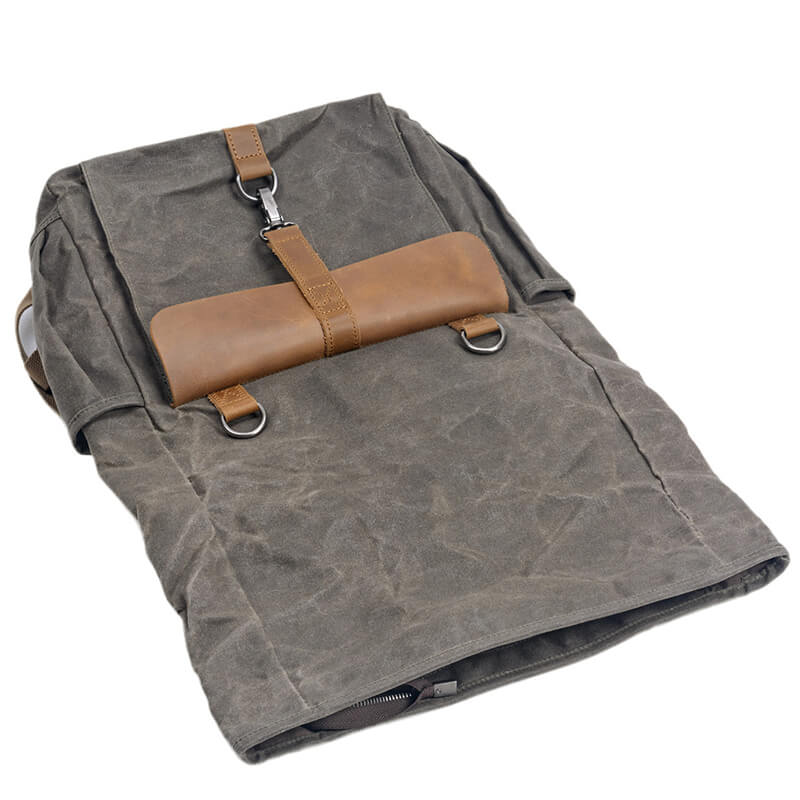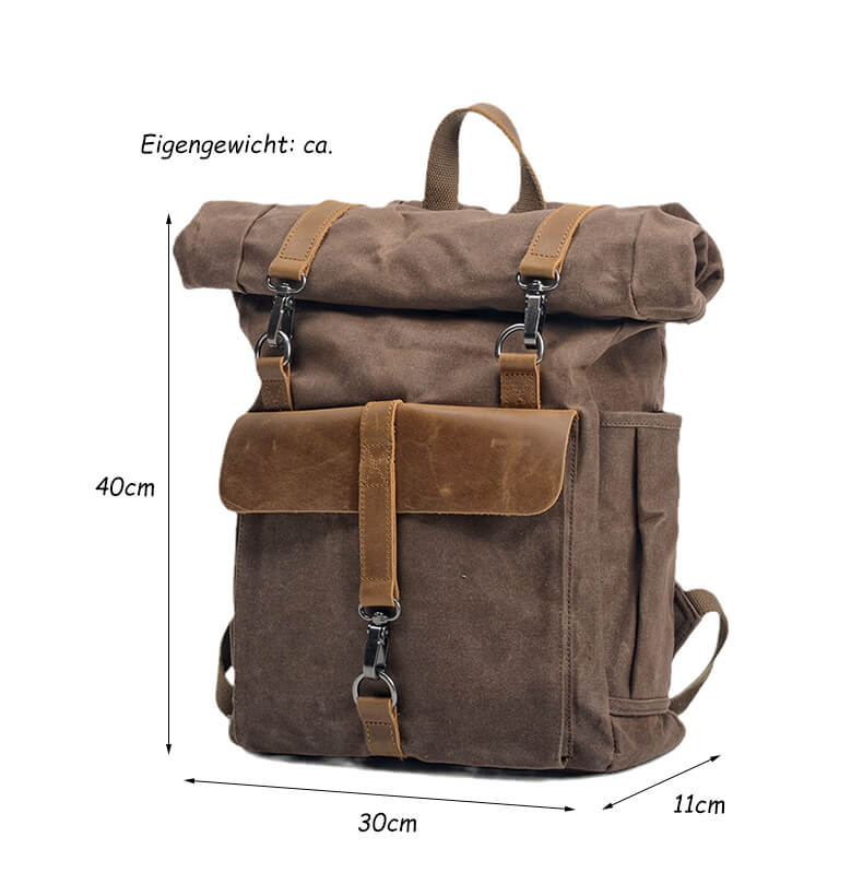 Hochwertiges Material: Der Rucksack besteht aus gewachstem Canvas, das strapazierfähig und langlebig ist, und wird mit braunem Crazy-Horse-Leder verziert, was das Gesamtbild verfeinert und die ästhetische Wirkung erhöht – ein wahres Statement für den einzigartigen Geschmack des Trägers.