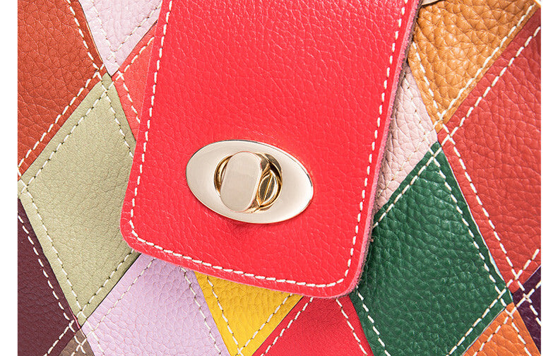 Einzigartiges Aussehen: Die Tasche ist aus farbigem Echtleder mit Patchwork-Technik gefertigt, was ihr eine reiche und modische Farbgebung verleiht. Jede Lederpartie ist sorgfältig zusammengenäht, um einen einzigartigen visuellen Effekt zu erzeugen, der die Tasche zu einem Highlight des Outfits macht und die Persönlichkeit betont.
