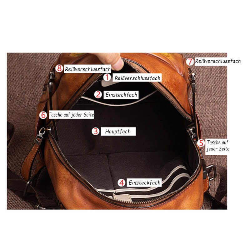 Diese Damenrucksack, aus hochwertigem vintage Leder und mit exquisitem Design, ist die perfekte Kombination aus Stil und Funktionalität. Auf der Vorderseite des Rucksacks ist eine blühende Lotusblume zu sehen, die mit feiner Schnitzkunst dargestellt wird und einen unvergesslichen Eindruck hinterlässt.
