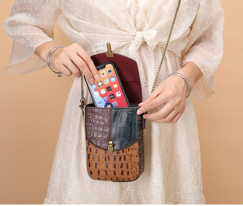 Einzigartiges Design, vielfältige Farben: Diese Damen-Handy-Tasche besteht aus zufällig zusammengesetzten, bunten Lederstücken, was sicherstellt, dass jede Tasche eine einzigartige Farbkomposition besitzt und den individuellen Stil zur Geltung bringt.