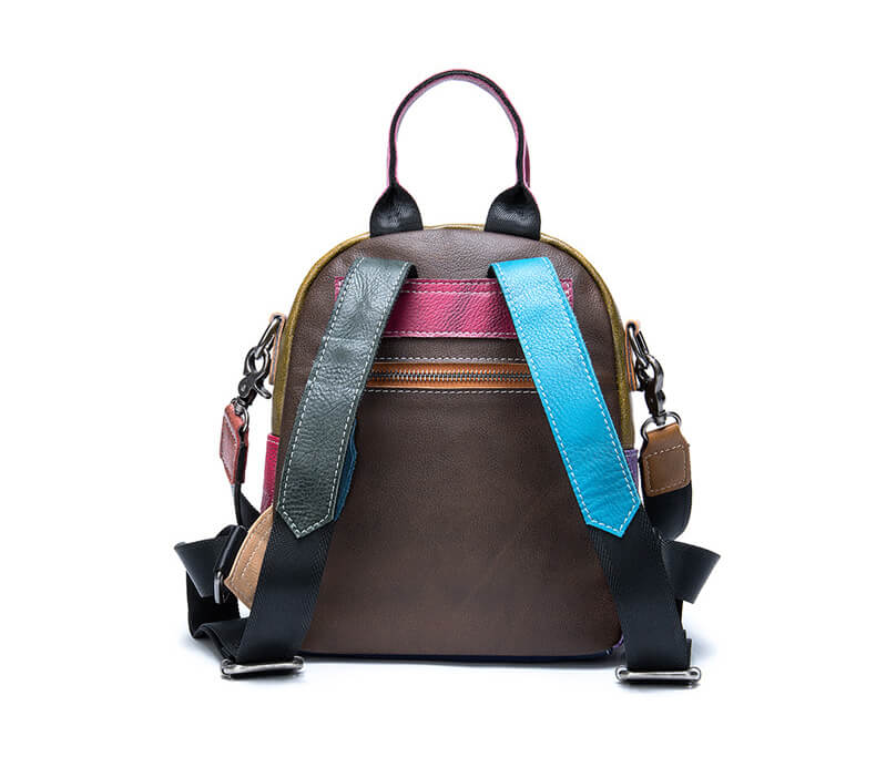 Buntes Patchwork-Design: Der Rucksack besteht aus farbigen Lederstücken, die zufällig ausgewählt und zusammengefügt wurden, sodass jeder Rucksack einzigartig ist.