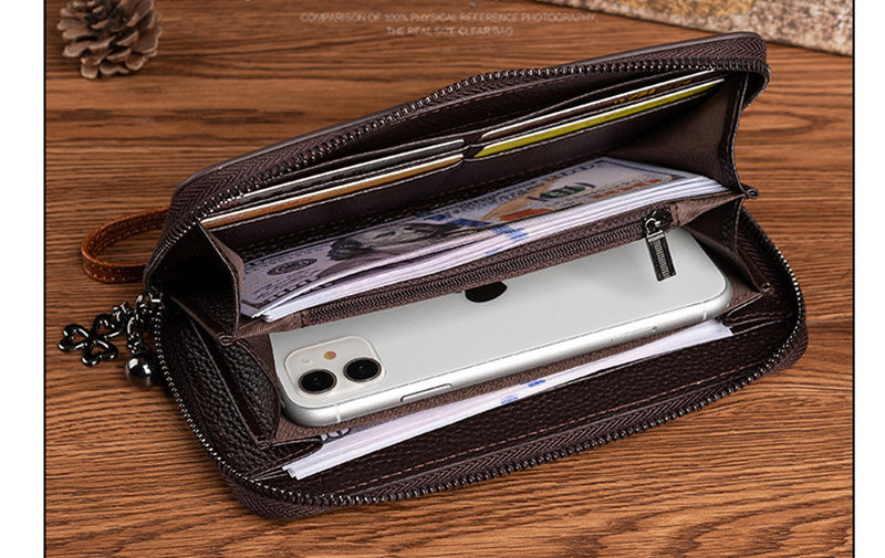 Das Portemonnaie ist mit einem Reißverschluss versehen, der die Sicherheit des Inhalts gewährleistet und dir während des Tragens ein beruhigendes Gefühl gibt. Öffnet man den Reißverschluss, wird das gut organisierte Innenleben sichtbar. Es bietet insgesamt 8 Kartenfächer, in denen du deine Bankkarten, Mitgliedskarten und mehr sortiert aufbewahren kannst, sodass du jederzeit schnell auf die benötigten Karten zugreifen kannst. Zudem gibt es ein Münzfach, ein Smartphone-Fach und ein großes Geldscheinfach. Das Münzfach bietet Platz für lose Münzen und Scheine, das Smartphone-Fach eignet sich ideal für dein Smartphone, und das große Geldscheinfach bietet ausreichend Platz für größere Geldbeträge und erfüllt somit vielfältige Aufbewahrungsbedürfnisse.