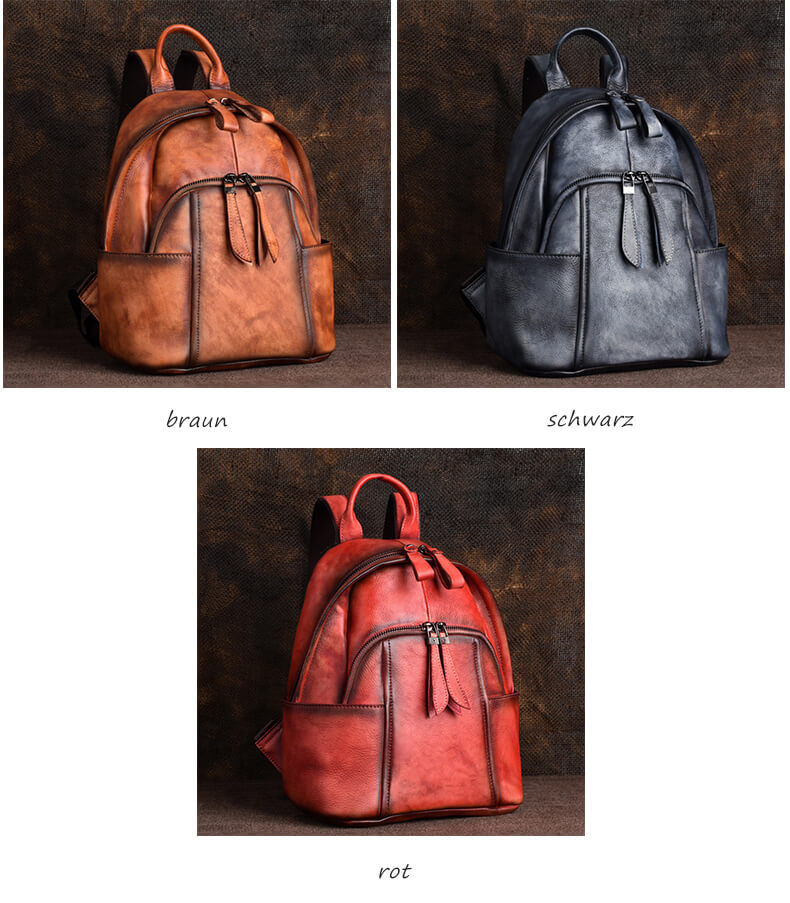 Dieser Damen Leder Rucksack präsentiert sich mit einer einzigartigen Vintage-Behandlung, die einen nostalgischen, aber dennoch modernen Charme ausstrahlt. Er ist in den klassischen Farben Schwarz, Braun und Rot erhältlich, die sich mühelos mit verschiedenen Stilrichtungen kombinieren lassen und den Anforderungen unterschiedlicher Anlässe gerecht werden.