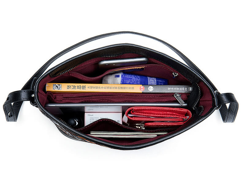 Vielseitiger Innenraum: Das Hauptfach ist mit einem Reißverschluss verschlossen, um die Sicherheit Ihrer Sachen zu gewährleisten. Im Inneren befinden sich zwei Reißverschlusstaschen und ein Steckfach, das eine übersichtliche Aufbewahrung von Mobiltelefon, Geldbörse, Schlüsseln und anderen alltäglichen Dingen ermöglicht.