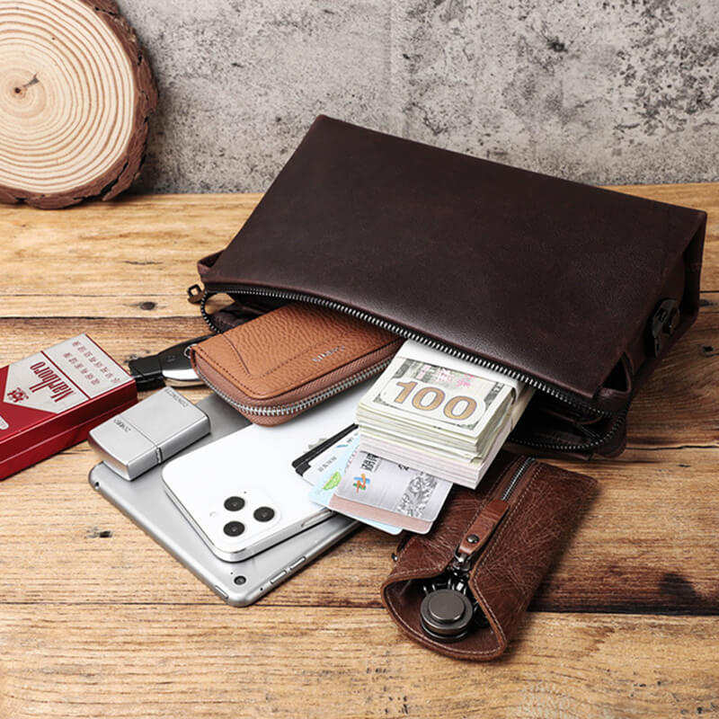 Hochwertiges Material, langlebig und zuverlässig: Diese Herren-Clutch besteht aus echtem Leder, das nicht nur durch seine hochwertige Haptik überzeugt, sondern auch den Stil und Geschmack des Trägers unterstreicht. Das Leder ist abriebfest und strapazierfähig – selbst nach längerem Gebrauch bleibt die Tasche wie neu.