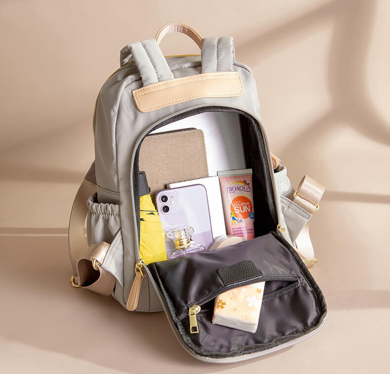 Das Hauptfach ist mit einem sicheren Reißverschluss versehen. Im Inneren befinden sich ein Reißverschlussfach, Einsteckfächer und ein Handyfach – ideal für die geordnete Aufbewahrung kleiner Gegenstände. Zwei zusätzliche Reißverschlusstaschen auf der Vorderseite bieten noch mehr Stauraum und machen den Rucksack zum perfekten Begleiter im Alltag oder auf Reisen.